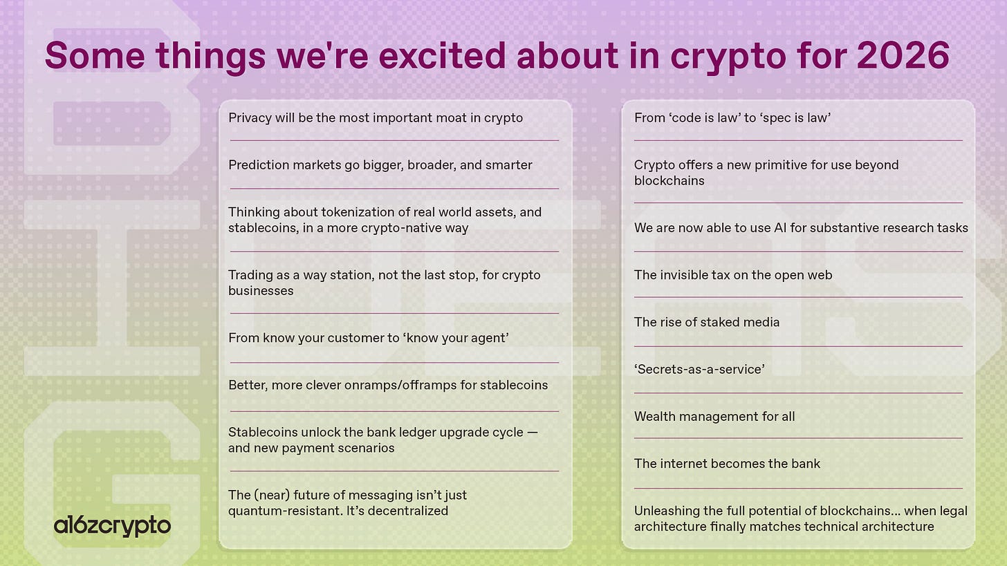 So below is a selection of some of the big ideas from various crypto team members (plus a few guest contributors) for what’s ahead — on topics ranging from agents and AI; stablecoins, tokenization, and finance; privacy and security; and prediction markets and other applications. For more of what we’re excited about for 2026, read the full post.